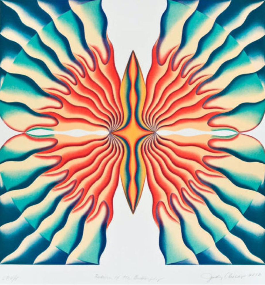 Synonymous with early feminist art, Judy Chicago has been challenging the male-dominated art world since the 1970s. Her characteristically colorful body of work includes paintings, tapestries, sculpture, and mixed-media installations celebrating women’s achievements. Chicago legally assumed the name of her hometown after becoming a widow at the age of 23, symbolizing her lifelong struggle with identity, which she chronicles in Through the Flower: My Struggle as a Woman Artist (1975). In homage to 1,038 women central to the history of Western civilization, Chicago’s most celebrated work, The Dinner Party (1974-79), exemplifies her ongoing endeavor as an artist, educator, and author to elevate women from the margins of society and history. The work—on permanent display at The Brooklyn Museum—features 39 place settings meant to represent famous women from history, from Joan of Arc to Emily Dickinson, with a further 999 names inscribed on the floor.