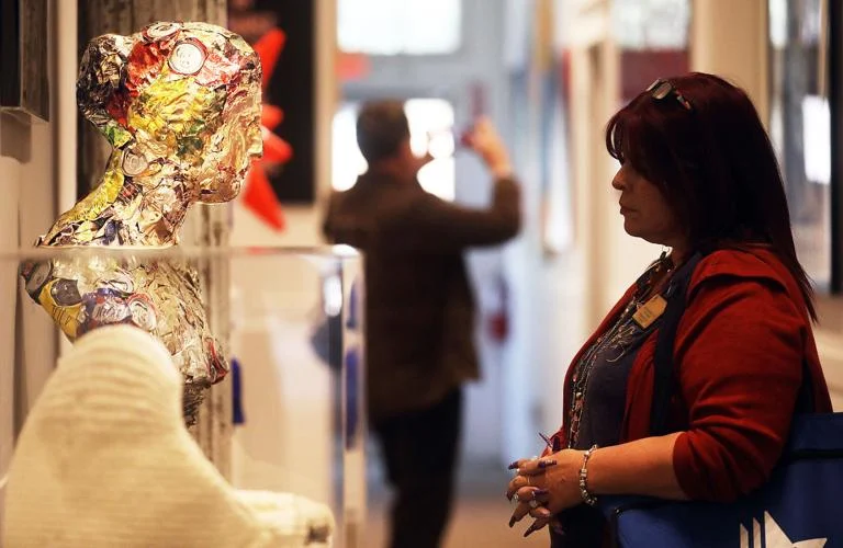 Images above: Left, Mitch Hundman from Carefree views artwork at the grand opening event at Gallery 818. Middle, artist Corie Mattie interacts with Artemizia Foundation opening guests last week. Mattie has a piece she created hanging on the wall. Right, several forms of artwork, including murals, are on display at the Artemizia Foundation's Galley 818. Grand opening guests peruse the gallery during last month's foundation event in Bisbee. PHOTOS by MARK LEVY HERALD/REVIEW